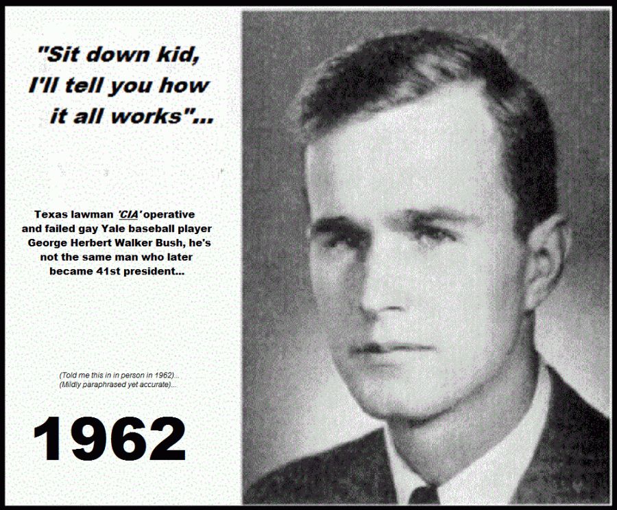Met a man whose birth certificate read “George Herbert Walker Bush” in the very early 1960’s, you could kind of tell he must have had a nice Mom or nice other female role model as he still had a very human side to him ~ After the murder of his beloved biological niece, a retarded girl with a big heart, he was angry beyond words and we came to an agreement of sorts cause although only 5 years old I’d also been grieving the murders of my birth mom and twin sister by the same Odessa pig’s as murdered his niece, thus for personal reasons he agreed to tell me everything he’d known of the lies America runs on as well as those the fascist Mason’s who control them had planned ~ Later on one of his two half brother’s, a German born ex alcoholic prick with emotional issues who like him worked in ‘CIA’ using the same name, quite a head fcuk for a 5 y\o already, one also grieving a loved one (Woman) lost to Odessa’s murderous ways, agreed to train me for the sake of simple revenge in all of the manipulative psychological techniques ‘CIA’ used to control people including the pseudo science of ‘NLP’ among other disciplines ~ As I’ve just stated above along with his gay failed Yale Baseball player brother this 2nd German born son of Prescott also used the name George Herbert Walker Bush in the Central Intelligence Agency and he also began to train me in the way Zionist shit really works around age 6 years, then along came a 3rd son of Prescott who executed my first girlfriend in front of me in cold blood, a 10 y\o Catholic girl called Monika, at which point I’d gone feral…