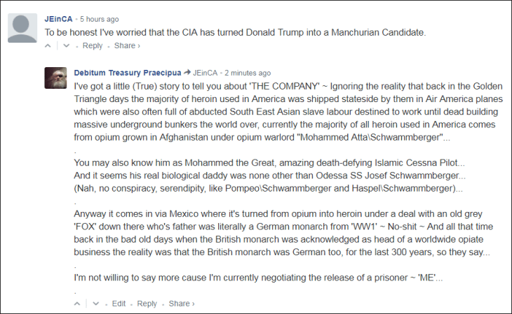 Anyway it comes in via Mexico where it’s turned from opium into heroin under a deal with an old grey ‘FOX’ down there who’s father was literally a German monarch from ‘WW1’ ~ No-shit ~ And all that time back in the bad old days when the British monarch was acknowledged as head of a worldwide opiate business the reality was that the British monarch was German too, for the last 300 years, so they say ~ I’m not willing to say more cause I’m currently negotiating…