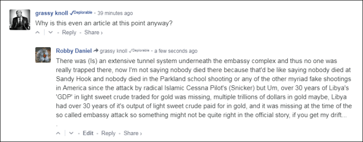 There was (Is) an extensive tunnel system underneath the embassy complex and thus no one was really trapped there ~ Now I’m not saying nobody died there because that’d be like saying nobody died at Sandy Hook and nobody died in the Parkland school shooting or any of the other myriad fake shootings in America since the attack by radical Islamic Cessna Pilot’s (Snicker) but Um, over 30 years of Libya’s ‘GDP’ in light sweet crude traded for gold was missing, multiple trillions of dollars in gold maybe, Libya had over 30 years of it’s output of light sweet crude paid for in gold, and it was missing at the time of the so called embassy attack so something might not be quite right in the official story…