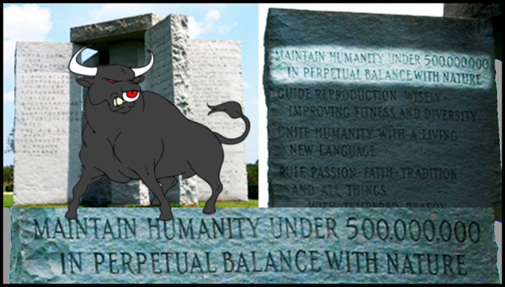 I’ve got a few perspectives to share, both about those realities above which no doubt the ass clowns of Washington will claim they don’t understand, and then also about my own personal motivations for doing these blogs ~ First the Georgia Guidestones and the obvious reference to a bull eventually implying just like the old adage do bears shit in a woods, some form of bullshit ~ The bullshit is in a few parts, the first part is pretty much everything on there is a lie, especially that part about being in harmony with nature when they’ve already poisoned the air sea well and lake water and the earth itself with all manner of toxins and are now in the process of further damaging humanity by degrading the nutrient levels of food with chemicals like Monstanto’s Roundup weed killer which, despite what you were told, is deliberately designed to inhibit plant uptake of micro nutrients by damaging the fine root structure of plants in addition to the contamination of food by the chemical composition of the so called weed killer, and the second is the mythical ideal earth population of 500,000,000 people being the target when the real goal is only 200,000,000 and 99.98% of those are destined to be living under feudal fascist globalist thuggery where they’ll envy the dead…